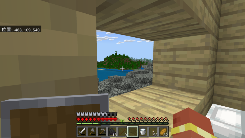 ペールオークの木の上から見えたジャングルらしきエリア。竹やパンダ、インコとの出会いを夢見て旅をスタート!しかし、拠点から遠く、夜になるリスクを考えて途中で中間拠点を作ることにしました。